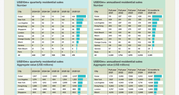 O segmento super-prime abrange transações superiores a 10 milhões de dólares. Nos 12 mercados avaliados — Dubai, Los Angeles, Nova Iorque, Hong Kong, Londres, Singapura, Orange County, Palm Beach, Miami, Genebra, Paris e Sidney — foram contabilizadas 474 vendas, menos 21% do que no trimestre anterior, num volume total de 8,5 mil milhões de dólares.