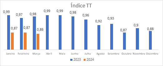 O Índice do Trabalho Temporário (Índice TT), que desde junho de 2023 apresenta um decréscimo gradual, continua a diminuir desde o início do ano, fixando-se em 0,87 em janeiro e fevereiro e 0,86 em março. Estes valores são inferiores ao índice registado nos meses homólogos do ano anterior.