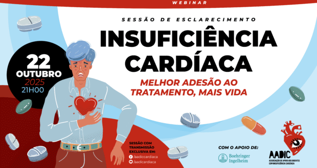 A AADIC – Associação de Apoio aos Doentes com Insuficiência Cardíaca realiza no próximo dia 22 de outubro, a partir das 21h, o webinar “Insuficiência Cardíaca: Melhor Adesão ao Tratamento, Mais Vida”. Para abordar este tema, a associação convidou Liliana Calixto, farmacêutica clínica, do Hospital Santa Cruz (ULSLO), Catarina Bastos, enfermeira da Clínica de Insuficiência Cardíaca, do Hospital São Francisco Xavier (ULSLO) e um doente para partilhar o seu testemunho. A moderação é da responsabilidade de Maria José Rebocho, cardiologista e membro do conselho técnico-científico da AADIC. Este evento tem o apoio da Boehringer Ingelheim e transmissão exclusiva na página de Facebook e canal de Youtube da Associação.